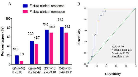 Continuous data were presented as mean ± standard error (S.D.E) or median with interquartile range (IQR), while categorical data were presented as percentages. Student’s t-test or Wilcoxon test was performed to compare indicators before and after UST treatment. A receiver operating characteristic (ROC) curve was established to figure out the cut-off value of UST trough concentration for predicting clinical fistula remission with the area under the curve (AUC), sensitivity, and specificity calculated. All analyses were conducted using SPSS 22.0. A statistically significant p-value was defined as a two-sided p-value < 0.05.