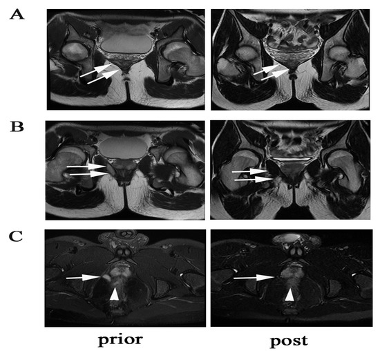 A case showing radiological fistula healing of a supralevator fistula. (A) The arrows show the supralevator part of the fistula closure with scarring. (B) The arrows show the infralevator part of the fistulas closure with scarring. (C) The arrows show vanishment of the supralevator lesion, and the triangle shows improvement of proctitis.