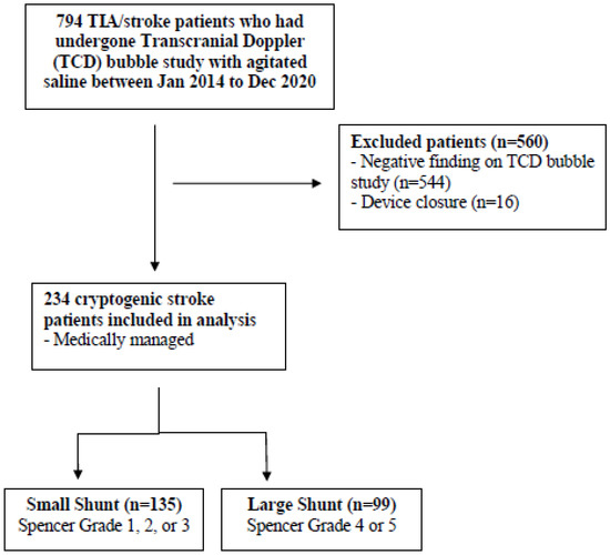 We performed a retrospective cohort study at a tertiary stroke center. Between January 2014 and December 2020, all consecutive patients with ischemic stroke or TIA who had undergone a non-invasive TCD bubble study with agitated saline were screened for inclusion [19,20]. Patients were included if they were at least 18 years old and had been diagnosed with cryptogenic stroke (stroke of unknown origin) according to the TOAST classification (one cause, more than one cause, no cause after work-up, and no cause with extensive or complete work-up) [21]. Patients with large artery atherosclerosis, lacunar stroke, cardioembolic causes (such as AF) and other definite causes of stroke were excluded. Cryptogenic stroke patients were excluded if they had a negative TCD bubble study or had undergone a PFO closure (Figure 1).