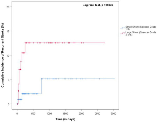 Kaplan–Meier curve comparing cumulative incidence of recurrent stroke between large (Spencer grade 4 or 5) and small (Spencer grade 1, 2, or 3) PFO shunts in patients concomitant cryptogenic stroke.