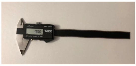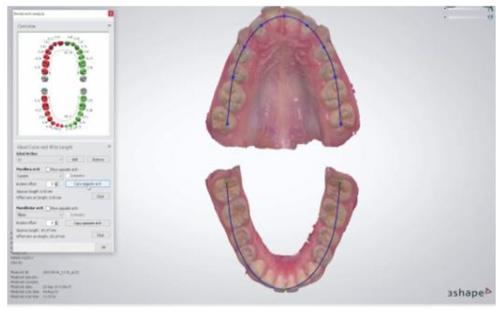 Each patient underwent a medical interview and clinical dental examination. Impressions for plaster models were taken, and an intraoral scan was performed. Taking alginate impressions and making digital scans of every patient took place on the same day. Anatomical impressions were taken in all patients using one type of impression material. An alginate mass with the brand name Kromopan was used for this purpose. Each new packaging of alginate mass, before opening, was checked for the tightness of the bag closure and the expiry date. The impression was taken with a disposable orthodontic spoon of an appropriate size for the patient. Factory-made perforations of the impression trays additionally increased the retention of the impression material. In the next stage, the impressions were secured and transported in a humid environment to the prosthetic laboratory as soon as possible, not exceeding 2 h. Next, the model was cast using Type III prosthetic plaster, characterized by a perfect white color and with high strength and low expansion. During the same visit, an intraoral scan was performed using the 3Shape Intraoral Scan TRIOS3 device. In order for the procedure to be performed correctly, the surfaces of the teeth were initially dried with compressed air, and then the patient’s teeth were scanned with a sterile scanner head, starting from the right quadrant in the maxilla. Thanks to the performed activities, virtual patient models were obtained, which were archived in the 3Shape server. The basic research method used in the study was orthodontic measurements. In the case of diagnostic plaster models, measurements were made using a manual electronic caliper by FWP VIS SA model MAUa Basic, an optimum master with a measuring range of 150 mm, with an accuracy of 0.01 mm (Figure 1). In order to minimize the occurrence of a measurement error, the same measurement conditions were created for the lighting in the room and the temperature present in it. To determine the compliance of the performed measurements, 10 parameters were selected, 5 of which concerned dental measurements and 5 of which concerned linear measurements. The orthodontic analysis of digital models was performed using a digital caliper using the OrthoAnalyzer 3Shape software, also with an accuracy of 0.01 mm (Figure 2).