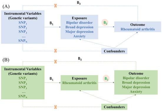 The design of MR analysis was to explore the causal effects between mental illness and rheumatoid arthritis. (A). The instrumental variables (IVs) were multiple single-nucleotide polymorphisms (SNP) linked to the mental disorders, the risk factors were bipolar disorder, broad depression, major depression, and anxiety, and the outcome variable was rheumatoid arthritis (RA). (B). The IVs are SNPs linked to the RA, the exposure factor was RA, and the outcome variables were the MR model of bipolar disorder, broad depression, major depression, and anxiety. B2 indicates the causal relationship between exposure and outcome, and B2 = B1/B3. B1 and B3 indicate the predicted value of a genetic variant on the exposure and outcome.