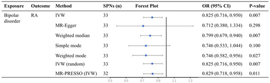 Corrected results did not change after removing one outlier using MR-PRESSO (Figure 2). In the 33 reported SNPs linked to bipolar disorder, after removing the SNP associated with potential confounding factors (Table S3), the result still showed that bipolar disorder was protective against the risk of RA (IVW OR = 0.842, 95%CI = 0.723 to 0.981, p = 0.03, Table S4). Nevertheless, this positive result was suggestive evidence after using the Bonferroni correction (0.0125 < p < 0.05).
