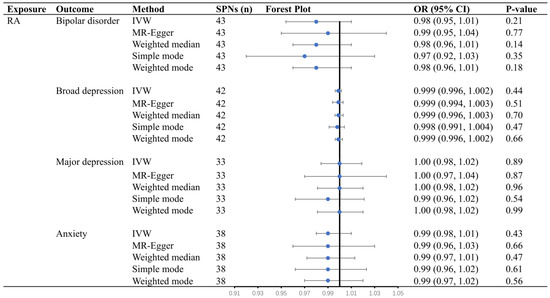 Conversely, we estimated the causal effects of RA on mental illness by MR analysis. As a result, there were no causal effects of RA on bipolar disorder (OR = 0.98, 95% CI = 0.96 to 1.01, p = 0.21), broad depression (OR = 1.00, 95% CI = 0.996 to 1.002, p = 0.44), major depression (OR = 1.00, 95% CI= 0.98 to 1.02, p = 0.89), and anxiety (OR = 0.99, 95% CI = 0.98 to 1.01, p = 0.43) by the primary method of IVW (Figure 3). Other statistical methods supported this conclusion (p > 0.05; Figure 3).