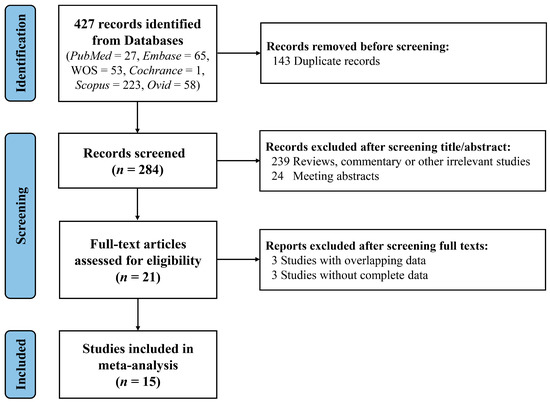 A total of 427 studies identified by the search strategies were retrieved (PubMed = 27, Embase = 65, Web of Science = 53, Cochrane = 1, Scopus = 223, Ovid = 58). After removing 143 duplicates, 284 records were analyzed by screening titles and abstracts. Then, 263 publications (including meeting abstracts, reviews, commentary, or other irrelevant studies) were excluded. Following reading the full texts, we removed 3 studies with overlapping data [15,19,20] and 3 without required data [21,22,23], and ultimately, 15 studies were involved in the meta-analysis [24,25,26,27,28,29,30,31,32,33,34,35,36,37,38]. Figure 1 outlines the study selection process.