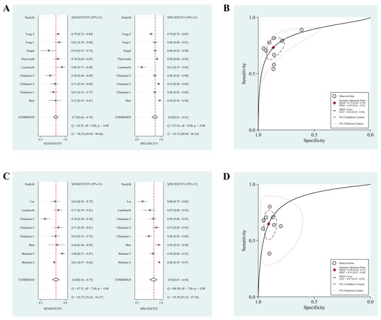 The pooled sensitivity and specificity with Forest plots as well as summary receiver operating characteristic curves of GALAD score for discriminating early-stage hepatocellular carcinoma within Barcelona Clinic Liver Cancer 0/A staging (A,B) or within Milan criteria (C,D) in chronic liver diseases.