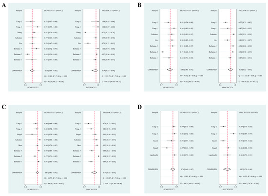 The pooled sensitivity specificity with Forest plots of GALAD score for discriminating hepatocellular carcinoma in patients with different etiologies. (A) Hepatitis B virus; (B) hepatitis C virus; (C) non-viral liver diseases; (D) cirrhosis.