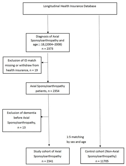 - Jang, H.D.; Park, J.S.; Kim, D.W.; Han, K.; Shin, B.J.; Lee, J.C.; Choi, S.W.; Suh, S.W.; Yang, J.H.; Park, S.Y.; et al. Relationship between dementia and ankylosing spondylitis: A nationwide, population-based, retrospective longitudinal cohort study. PLoS ONE 2019, 14, e0210335. [Google Scholar] [CrossRef]