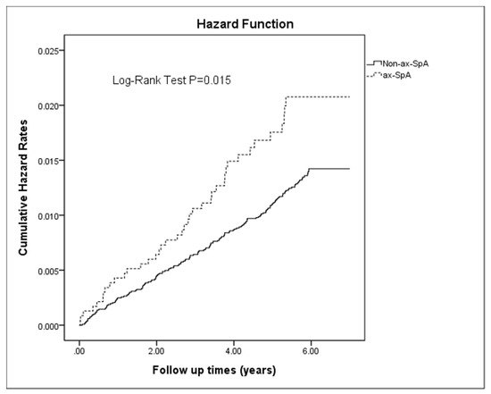 Kaplan–Meier hazard curves revealed that the cumulative incidence of dementia was higher in the axSpA group than in the comparison group (p < 0.05; Figure 2).