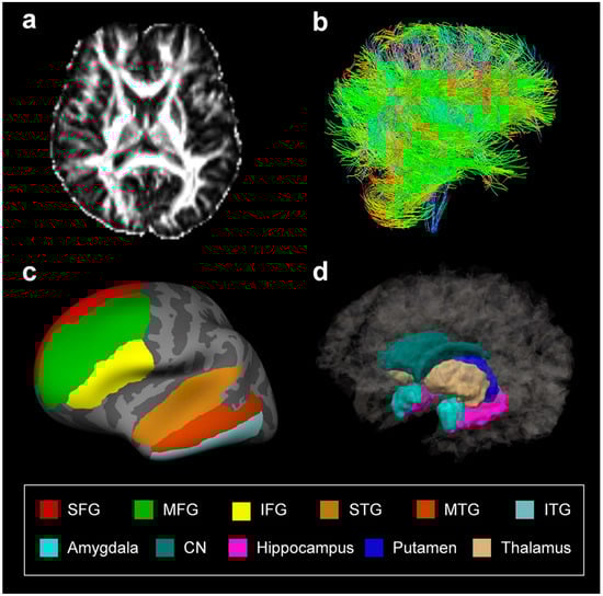 Illustration of diffusion-weighted imaging (a), fiber tracts (b), cortical regions of interest (ROIs) (c), and subcortical ROIs (seed regions) (d). SFG; superior frontal gyrus, MFG; middle frontal gyrus, IFG; inferior frontal gyrus, STG; superior temporal gyrus, MTG; middle temporal gyrus, ITG; inferior temporal gyrus, CN; caudate nucleus.