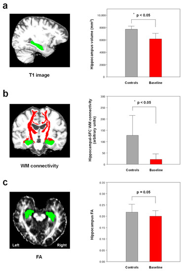 The decreased hippocampal volume (a) and hippocampal-superior frontal gyrus (SFG) white matter (WM) connectivity (b) in the patients with early AD (baseline) compared to those in the healthy controls (Bonferroni-corrected, p < 0.05). The patients with early AD showed decreased fractional anisotropy (FA) in the hippocampus (p = 0.05, not corrected for multiple comparisons) (c). Green in the left figure, hippocampal seed ROI; red in left figure, WM connectivity. * Meets Bonferroni-corrected significance level (p < 0.05).