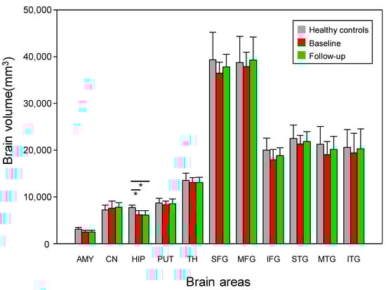 The mean brain volume in the 11 ROIs in the patients with early AD (baseline and 6-month follow-up) and the healthy controls. However, no significant differences were detected in the 11 ROIs before and after donepezil treatment in the patients with early AD. AMY; amygdala, CN; caudate nucleus, HIP; hippocampus, PUT; putamen, SFG; superior frontal gyrus, MFG; middle frontal gyrus, IFG; inferior frontal gyrus, STG; superior temporal gyrus, MTG; middle temporal gyrus, ITG; inferior temporal gyrus. * Meets Bonferroni-corrected significance level (p < 0.05).