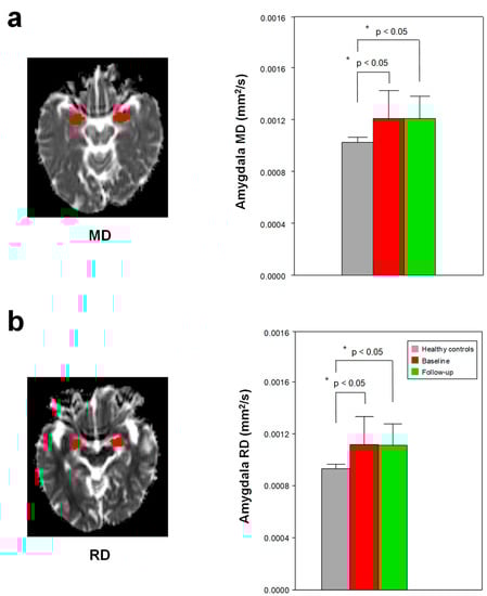 The higher mean diffusivity (MD) (a) and radial diffusivity (RD) (b) in the amygdala in the patients with early AD compared to those in the healthy controls (Bonferroni-corrected, p < 0.05). None of the other 10 ROIs showed significant differences in the DTI scalars between the healthy controls and the patients with early AD. In addition, no significant differences were found between the patients with early AD and the treated patients in the 11 ROIs. Red in the left figure, the amygdala ROI. * Meets Bonferroni-corrected significance level (p < 0.05).