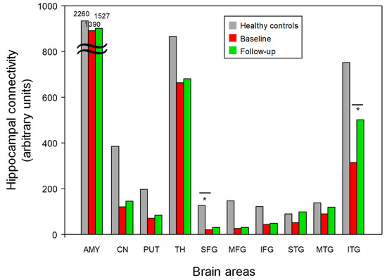 The functional connectivity findings using the hippocampus as a seed region in the patients with early AD (baseline and 6-month follow-up) and the healthy controls. The patients with early AD showed a significant decrease in hippocampal-SFG WM connectivity compared to the healthy controls (Bonferroni-corrected, p < 0.05). Following the 6-month donepezil treatment, the patients with early AD showed increased hippocampal-ITG WM connectivity (Bonferroni-corrected, p < 0.05). AMY; amygdala, CN; caudate nucleus, HIP; hippocampus, PUT; putamen, SFG; superior frontal gyrus, MFG; middle frontal gyrus, IFG; inferior frontal gyrus, STG; superior temporal gyrus, MTG; middle temporal gyrus, ITG; inferior temporal gyrus. * Meets Bonferroni-corrected significance level (p < 0.05).