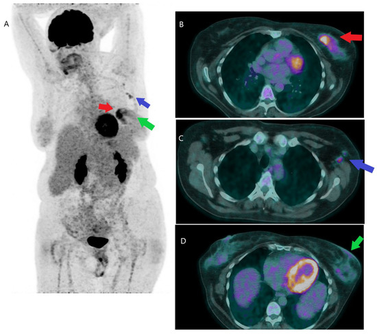 FDG PET/CT in initial staging. A 52-year-old woman with a newly diagnosed inflammatory left breast invasive ductal carcinoma of 29 mm, was referred for initial staging with FDGPET/CT. The PET/CT MIP image (A) shows the primary cancer (red arrow), axillary adenopathies (violet arrow), and cutaneous involvement (green arrow). Image (B) (fusion image, trans-axial view) shows the primary lesion of the left breast (red arrow). Image (C) (fusion image, trans-axial view) shows the axillary lymph node involvement of Berg’s level I (violet arrow). Image (D) (fusion image, trans-axial view) shows the cutaneous involvement (green arrow).