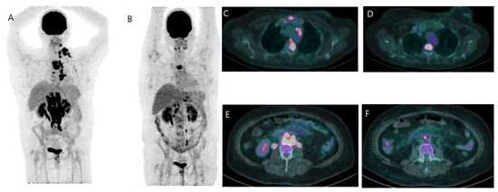 FDG PET/CT in evaluation of treatment response. A 47-year-old woman with metastatic HER2+ BR was treated by paclitaxel and pertuzumab and was referred for evaluation of treatment response. The PET/CT MIP images (A,B) show a significant partial metabolic response at 3 months of interval. Images (C,D) (fusion image, trans-axial view) show the regression of mediastinal adenopathy and sternum lesion and also the persistence of a bone lesion of T4. Images (E,F) (fusion image, trans-axial view) show the important regression of retroperitoneal lymph node involvement.