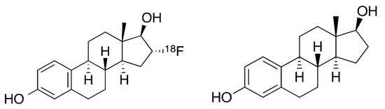 FES is an analogue of oestradiol fluorinated on the carbon 16 of the D ring (Figure 5). Various fluorinated oestradiol analogues have been proposed during the last three decades for clinical PET imaging. Among them, the FES seems to be the most effective, as it can be produced with a high specific activity and it has a good binding affinity to the oestrogen receptors (ERs) [66,67,68]. FES uptake depends on both ER density and the availability of ER for ligand binding [69]. Thus, a negative FES PET does not mean there is no malignancy [70].