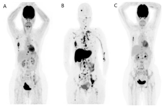 At CT, the size of lesions in metastatic BC helps measure treatment response. On the contrary, FDG PET can measure metabolic changes, which is better in predicting treatment response than anatomic changes [39]. Two studies discovered that FDG PET could evaluate response vs. non-response after 1–3 therapy cycles [40,41]. Moreover, other studies found that FDG PET can differentiate response from non-response, which was relevant to various and distinct chemotherapy and hormonal courses [42,43].