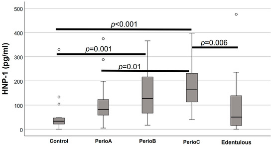 Salivary human neutrophilic peptide (HNP)-1 levels in relation to the extent of periodontal destruction. Significant differences between the groups are marked with connector lines and p values are denoted above (the empty circles indicate outliers).