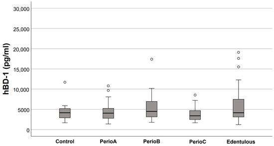 Salivary human β-defensin (hBD)-1 levels in relation to the extent of periodontal destruction (empty circles indicate outliers). No significant differences were found between the groups.