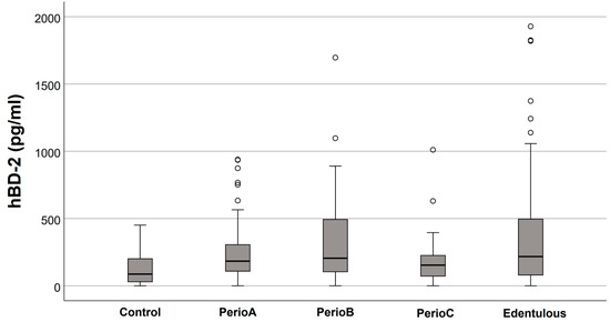Salivary human β-defensin (hBD)-2 levels in relation to the extent of periodontal destruction (empty circles indicate outliers). No significant differences were found between the groups.