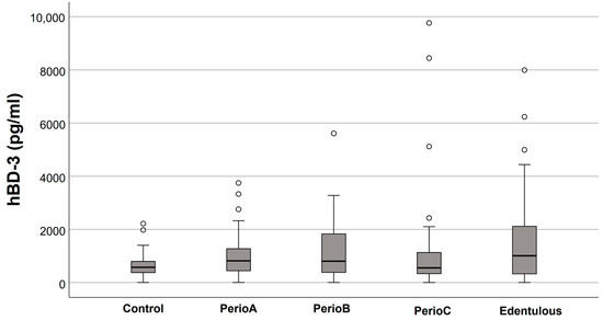 Salivary human-β defensin (hBD)-3 levels in relation to the extent of periodontal destruction (empty circles indicate outliers). No significant differences were found between the groups.