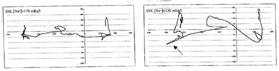 After the normalization of serum sodium, patients were evaluated again. In tandem gait, patients with clinically asymptomatic hyponatremia had large increases in their “total traveled way” (TTW) (from approximately 1 m with normal serum sodium to 1.3 m during hyponatremia). A typical case is presented in Figure 1. As a model of comparison after mild alcohol intake (0.55 g/kg body weight), which is well-known for attention and balance impairment, the TTW in tandem gait increased slightly from approximately 1 to 1.1 msec (n = 10) [6].