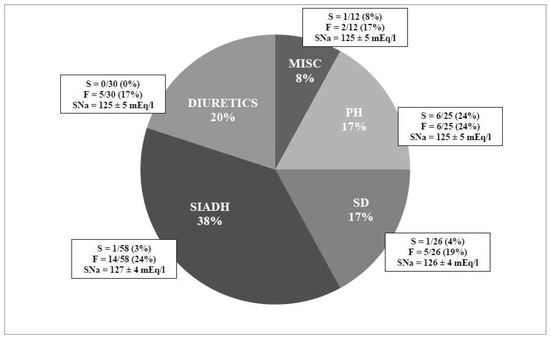 Causes of hyponatremia; number of falls and seizures in 151 consecutive patients without edema or ascites hospitalized via the emergency room. SD: salt depletion; PH: polydypsia; MISC: miscellaneous causes of hyponatremia; S: seizure; F: fall; and SNa: mean serum sodium of the subgroup on admission.