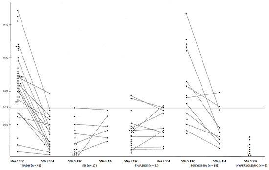 Evolution of the UCa/UCr ratio before and after the correction of hyponatremia of different origins (the horizontal line represents the upper normal limit obtained in adults before breakfast) (adapted from ref. [36] with the permission of the authors).