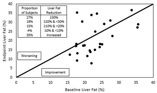 | Liver fat (%) | 22.0 (19.4; 25.0) | 18.2 (14.8; 29.1) | −19% | 0.0972 |