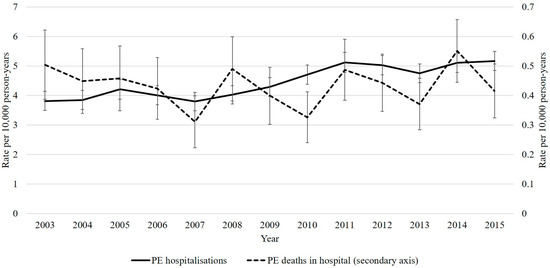 Figure 2 suggests that the age-sex standardized rate of PE hospitalizations increased, from 3.8 per 10,000 person-years (95% CI 3.5–4.1) in 2003 to 5.2 per 10,000 person-years (4.8–5.5) in 2015. The rate of in-hospital deaths, however, remained constant, changing from 0.50 (CI 0.39–0.62) per 10,000 in 2003 to 0.42 (0.32–0.51) per 10,000 in 2015.