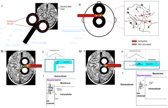 (I). Electric field lines induced by a typical figure-8 TMS coil. (II). Under the figure-8 central segment, only neurons aligned parallel to the electric field, along the coil axis, are activated (indicated in red). (III). Where neurons under the coil center have axon parallel to the induced electric field and bends away from it (a), the field is maximal at the bend point (b) and leads to transmembrane potential Vm across the voltage-gated ion channels (c), which are then opened, and action potential is initiated. (IV). Where neurons under the coil center have axon parallel to the induced electric field and terminate (a), the field is maximal at the axon terminal (b) and leads to transmembrane potential Vm across the voltage-gated ion channels (c), which are then opened, and action potential is initiated.