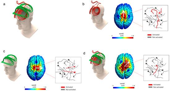 - Salvador, R.; Silva, S.; Basser, P.J.; Miranda, P.C. Determining which mechanisms lead to activation in the motor cortex: A modeling study of transcranial magnetic stimulation using realistic stimulus waveforms and sulcal geometry. Clin. Neurophysiol. 2011, 122, 748–758. [Google Scholar] [CrossRef]