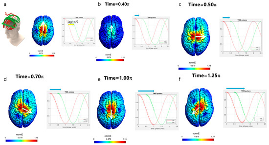 Hence, the idea of rfTMS is to operate the two coils not simultaneously, but instead with a lag of ¼ of a cycle (equivalent to a phase shift π/2); Figure 4 demonstrates this. The upper (green) coil is operated with a lag of 90° degrees (¼ cycle) after the lower (red) coil. The pulse timing diagram is shown on the right of each panel of Figure 4, presenting the electric field pulse induced by each coil. The pulses have a Cosine shape, and a full cycle (360° degrees) is completed when the amplitude re-assumes its initial value. If both coils are operated with biphasic pulses, then the lower (red) coil is terminated at t = 2 π. In such a case, the field vector would cover only 270° of the phase space. Hence, in the demonstration shown in Figure 4, the lower (red) coil is operated with two consecutive biphasic pulses, in order to have an overlap with the upper (green) coil between t = 2 π and t = 2.5 π so that the field vector completes a full cycle of 360°.