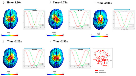 In the following, we will go step by step during the pulse and see how exactly the combined effects of the two coils lead to circular rotation of the induced electric field direction. Figure 4 presents the evolution of the field during the pulse. In Figure 4a top left is shown the rfTMS coils array with the lower red coil and the upper green coil in orthogonal orientations. The timing in the pulse is indicated by circles on the pulses of the lower (red) coil and the upper (green) coil in the pulse diagram shown for each stage. The white arrow on the colored field map over the brain indicates the field direction at the point of the maximal field. At the pulse onset (Figure 4a; time t = 0), only the lower coil is operated, and it induces a field in a posterior–anterior direction. At time t = 0.4 π (Figure 4b; t = 0.4 × 180° = 72°), still, only the lower coil is operated, and the field is still in a posterior–anterior direction but with reduced intensity. At time t = 0.5 π (Figure 4c; t = 0.5 × 180° = 90°), the field induced by the lower coil is zero, and the upper coil is now operated and induces a field in a left–right direction. At time t = 0.7 π (Figure 4d; t = 0.7 × 180° = 126°), the upper coil still induces a field in the left–right direction with reduced intensity (green arrow over the brain), yet the lower coil now induces a field in a direction opposite to its initial direction, in the anterior–posterior direction (red arrow over the brain). The resultant field is the vector sum of the fields induced by the two coils. Hence, the field that will be induced at that instant will be at an angle downward from the left–right axis, as indicated by the white arrow. It is important to understand that at each instant, there is a field in one and only one direction since the electric field is a vector. Hence, at that instant and point, there is no field along the anterior–posterior axis nor along the left–right axis, but only in the direction indicated by the white arrow. At time t = 1.0 π (Figure 4e; t = 180°), the field induced by the upper coil is zero, while the lower coil induces a field at maximal amplitude in the anterior–posterior direction. At time t = 1.25 π (Figure 4f; t = 1.25 × 180° = 225°), the amplitude of the field induced by the lower coil is reduced while the upper coil now induces a field in a direction opposite to its initial direction, in the right–left direction. Hence, the field vector keeps rotating and now points in the direction indicated by the white arrow, to the left and posteriorly. At time t = 1.5 π (Figure 4g; t = 1.5 × 180° = 270°), the field of the lower coil is zero and the upper coil induces a field at maximal amplitude in the right–left direction. At time t = 1.75 π (Figure 4h; t = 1.75 × 180° = 315°), the amplitude of the field induced by the upper coil is reduced while the lower coil now induces a field in the posterior–anterior direction. Hence, the field vector keeps rotating and now points in the direction indicated by the white arrow, to the left and anteriorly. At time t = 2 π (Figure 4i; t = 2 × 180° = 360°), the field induced by the upper coil is zero, while the lower coil induces a field at maximal amplitude in the posterior–anterior direction. Up until now, the field vector spanned all the directions from left–right to posterior–anterior in a clockwise rotation. To span the remaining directions, at time t = 2.25 π (Figure 4j; t = 2.25 × 180° = 405°), the amplitude of the field induced by the lower coil is reduced while the upper coil now induces a field in the left–right direction. Hence, the field vector keeps rotating and now points in the direction indicated by the white arrow, to the right and anteriorly. At time t = 2.5 π (Figure 4k; t = 2.5 × 180° = 450°), the field of the lower coil is zero and the upper coil induces a field at maximal amplitude in the left–right direction. Hence, now the field vector has spanned all directions. The result is that neurons oriented in various directions are all stimulated within less than a millisecond (Figure 4k), in contrast to conventional unidirectional TMS where only a small fraction of the neural population, oriented parallel to the induced field, are stimulated when operating close to the threshold of neural stimulation (as in the examples of Figure 3). Increasing, the intensity above the threshold would recruit additional neurons with components aligned at angles close to the field. However, since clinical applications are generally limited to 120% of the motor threshold [1], stimulation with unidirectional TMS is limited to structures with favorable orientations.