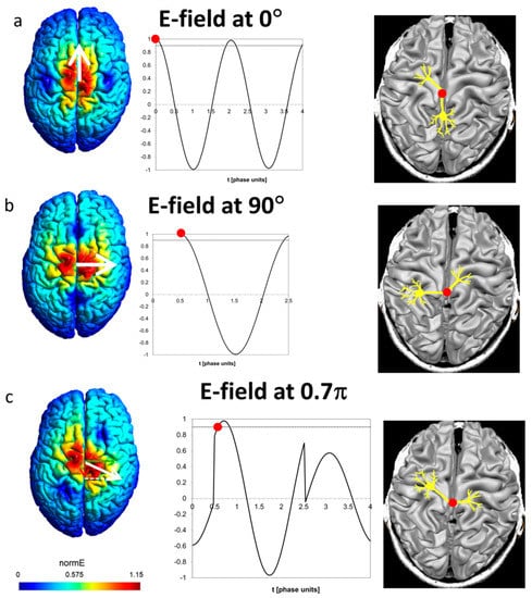A more complex case is presented in Figure 5c, depicting a neuron with a preferred orientation of 0.7 π. Here, both coils contribute by the projections of their fields on the respective axis. Between t = 0 and t = 0.5 π, only the lower coil is operated and induces field in the opposite direction, which leads to hyperpolarization. Action potential is initiated at about t = 0.6 π, after the upper coil is operated at t = 0.5 π, and the field at the site in the preferred direction leads to depolarization and reaches the threshold. The essential prerequisite for neural stimulation is not the particular pulse shape (biphasic, monophasic, or other) but the induction of depolarization above the threshold, as demonstrated in the controllable TMS (cTMS) setup, e.g., ref. [31], with near-rectangular electric field pulses.
