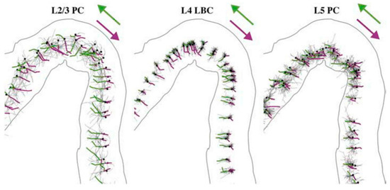 Action potential initiation points in the primary motor cortex layer L2/3 pyramidal cells (L2/3 PC), layer 4 large basket cells (L4 LBC), and layer 5 pyramidal cells (L5 PC) depend on the orientation. Action potentials initiate at terminal points and propagate to proximal branch points. Structures stimulated by monophasic posterior–anterior stimulation are colored in green and by anterior–posterior stimulation by magenta. Somas indicated by black dots. (Reproduced from [22].)