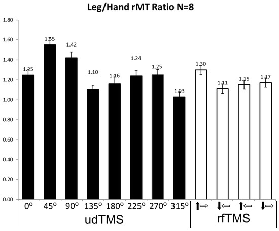 The physiological effects of rfTMS were compared with conventional unidirectional TMS (udTMS) in the motor cortex of healthy subjects [29,30]. rfTMS induced a significantly lower resting motor threshold (rMT) in both the hand and leg motor cortices compared to unidirectional H7 Coil Deep TMS [29,30]. In accordance with previous studies [26,32,33], the hand motor cortex was found to be highly un-isotropic with the lowest rMT found at 45° to the posterior–anterior (P-A) axis and highest rMT for angles perpendicular to the preferred orientation, at 135° and 315° (Figure 4 in [30]). The leg motor cortex is deeper than that of the hand [34,35,36,37]. In order to assess the relative contributions of depth and orientation to the rMT, we now analyzed the ratio of the leg rMT to the hand rMT for eight udTMS orientations of the H7 coil and four rfTMS states covering different 270° portions of the phase space [30]. The ratios were calculated per subject and state. The results are shown in Figure 7.