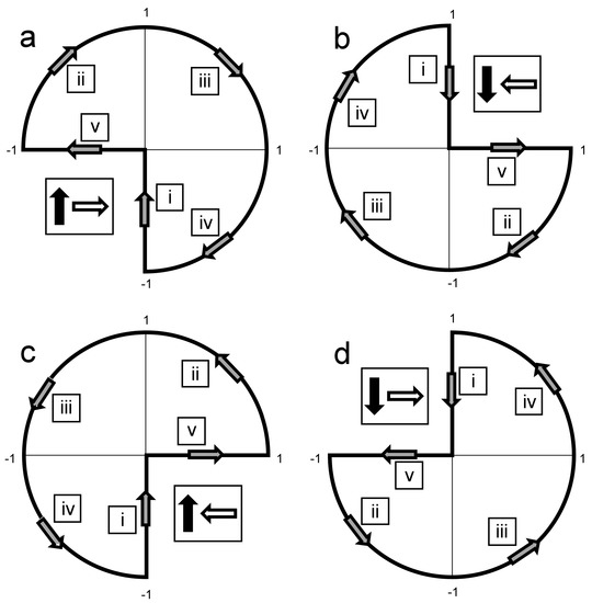 A reconstruction of the effective electric field created from the combined operation of the two perpendicular coils, for the four rfTMS polarity states. The field of coil #1 is directed along the y-axis (anterior-posterior) and the field of coil #2 along the x-axis (lateral-medial). The effective field completes ¾ of a full cycle during the magnetic pulses, as indicated by the gray arrows. The Latin numbers in squares indicate the order of evolvement of the field vector during the pulses. The polarities were induced such that during the second stroke of the biphasic pulse by the lower and upper coils the induced current in the brain was P-A and L-M (left-right on the left hemisphere) (↑→, panel (a)), A-P and M-L (↓←, panel (b)), P-A and M-L (↑←, panel (c)), or A-P and L-M (↓→, panel (d)), respectively. The black and white arrows represent the polarity induced during the second stroke of the biphasic pulse by the lower and upper coils, respectively (Reproduced from [30]).