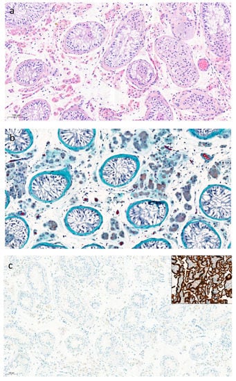 - Ooba, T.; Ishikawa, T.; Yamaguchi, K.; Kondo, Y.; Sakamoto, Y.; Fujisawa, M. Expression and Distribution of Laminin Chains in the Testis for Patients with Azoospermia. J. Androl. 2008, 29, 147–152. [Google Scholar] [CrossRef] [PubMed]