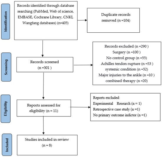 From the databases, 405 articles were selected, and 104 duplicate records were removed. 301 records were screened, of which 290 needed to be excluded for different reasons (100 studies included surgery, 55 studies included no control group, 53 studies included Achilles tendon rupture, 52 studies included other systemic conditions, 10 included major injuries to the ankle, and 20 studies included combined therapy.) A total of 11 articles were then assessed for eligibility. However, during our second screening, we found 3 articles excluded for other reasons: 1 article was experimental research, 1 was a retrospective case study, and 1 had no primary outcome indicator. In the end, only 8 high-quality articles were selected and included in our study.