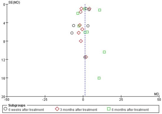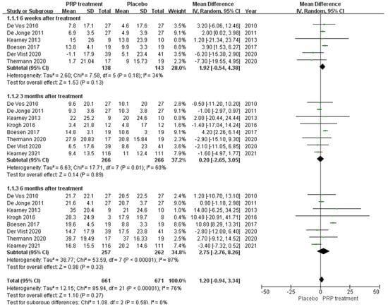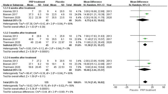 A total of 93 patients in three publications correctly and reasonably described the VAS score change for pain at the 6-,12-, and 24-week follow-ups using a 0 to 100 grading scale. Our results showed no significant difference in VAS score improvement at 6 and 24 weeks between the PRP injection group and the control group, respectively (MD = 6.75, 95% CI = (−6.12, 19.62), I2 = 69%, p = 0.30) and (MD = 10.46, 95% CI = (−2.44 to 23.37), I2 = 69%, p = 0.11). However, at 12 weeks of treatment (MD = 11.30, 95% CI = (7.33 to 15.27), I2 = 0%, p < 0.00001) (Figure 7) we observed a significant improvement in the PRP treatment group compared to the placebo group. Using the Revman 5.4 software to transform the fixed effects model and the random effects model, the included studies were re-combined to calculate statistics, showing essentially no difference between the PRP treatment group and the placebo group in terms of mean VAS scores and 95% confidence intervals. After excluding each study once individually, the combined effect sizes obtained from the new meta-analysis were not significantly changed compared to the total effect sizes. The above sensitivity analyses showed that the meta-analysis results were robust and reliable.