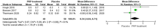 Thirdly, our meta-analysis may not apply to all AT patients; previous RCTs utilised a single injection of PRP solution, but Boesen et al. [] administered four injections two weeks apart, which may explain the divergent findings. Platelets in PRP release most growth factors from the alpha-granules shortly after activation, and some can be inactivated in situ. Therefore, a single PRP injection is insufficient to induce tendon regeneration and repair. According to Abate et al., patients with persistent tendinopathy with several PRP injections showed improved function and discomfort []. PRP may help repair tendinitis, although its mechanism is unknown. In this case, we can assume that multiple PRP injections can enhance AT’s healing process. Thus, future randomised controlled trials will investigate the prognostic advantages of multiple PRP injections.