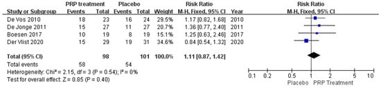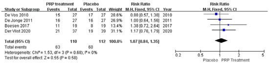 A total of four papers with 222 patients correctly and reasonably described improvements in patient satisfaction. There was no statistical heterogeneity between studies (I2 = 0%, p = 0.68), so a fixed effects model was used to calculate the combined statistic. The results showed that patient satisfaction was higher in the PRP-treated group (experimental group) than in the placebo group (control group) [RR = 1.07, 95% CI (0.84, 1.35), p = 0.58] (Figure 8), a statistically insignificant difference. This indicates that the PRP treatment group did not significantly improve patient satisfaction relative to the placebo group. Using the Revman 5.4 software to transform the fixed effects model and the random effects model, the included studies were re-combined to calculate statistics, showing no difference between the PRP treatment group and the placebo group regarding patient satisfaction, and 95% confidence intervals. The combined effect sizes obtained from the new meta-analyses were not significantly different from the total effect sizes after excluding each study individually once. The above sensitivity analyses showed that the meta-analysis results were robust and reliable.