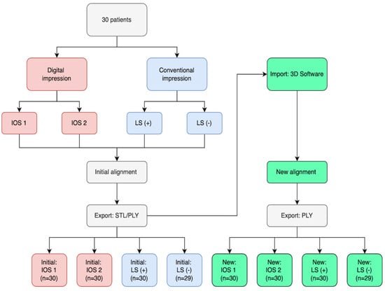 A total of 238 initially and newly aligned scans by IOS 1 (n = 60), IOS 2 (n = 60), LS (+) (n = 60) and LS (−) (n = 58) were analyzed in the present study. The cast model of one patient was damaged and was therefore no longer available for the disabled intersection mode scan (LS−). The mean age of the 30 patients (16 females, 14 males) was 44.6 years (range: 26–70 years). The distributions of complete- and partial-arch intraoral scans were 8 and 22, respectively, in the IOS 1 and 9 and 21, respectively, in the IOS 2 group. One of the IOS 1 scans demonstrated an incomplete mesh in one quadrant, which was excluded from the complete- and included in the partial-arch analysis.