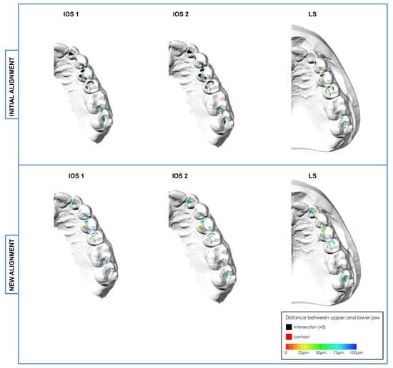 The comparison of the OCA among initially and newly aligned scans revealed a similar distribution for IOS 2, LS (+), and LS (−) if an interocclusal distance of 0–100 μm was selected. However, a noticeable reduction of the OCA could be observed for an interocclusal distance of up to 10 μm (Figure 4). The defined interocclusal distance affects the OCA, as reported in a study on masticatory performance []. However, the present results also suggest that refinement of contact points in newly aligned scans occurs at very short interocclusal distances.