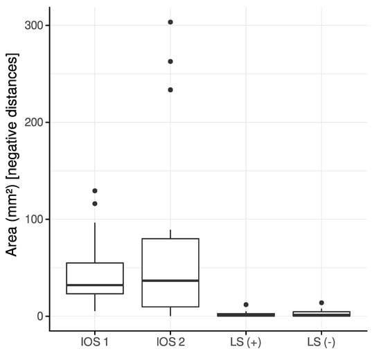The area of intersection, i.e., the summation of polygon areas contributing to negative distances, for partial-arch scans was largest for IOS 2 (79.23 ± 101.89 mm2) and IOS 1 (48.28 ± 36.74 mm2), followed by LS (−) (2.77 ± 3.46 mm2) and LS (+) (2.01 ± 2.76 mm2) (Figure 4).