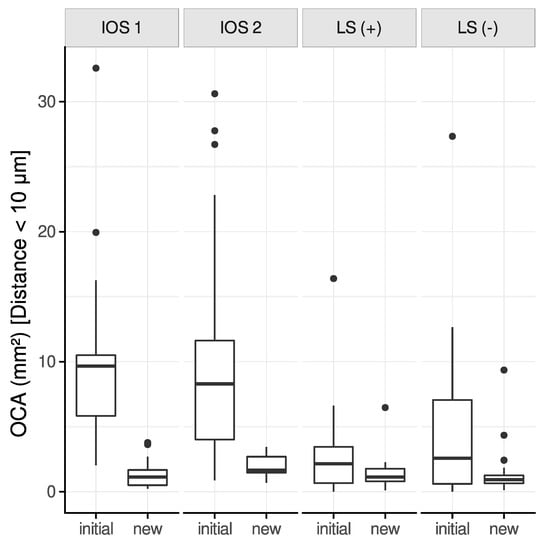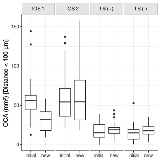 Complete-arch scans demonstrated a similar distribution of the OCA between initial and new alignments compared to partial-arch scans. IOS 1 and IOS 2 exhibited a decrease of the OCA of −37.12 mm2 and −13.64 mm2, respectively. Again, the LS (+) and LS (−) showed an increase in the OCA, i.e., 11.53 mm2 and 9.12 mm2, respectively. IOS 1 (p < 0.01) and LS (+) (p = 0.05) demonstrated a significant reduction of the OCA.