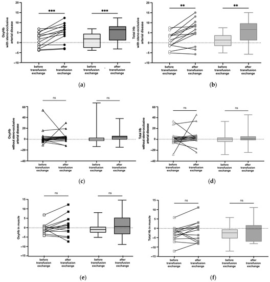 NIRS measurement of relative amounts of OxyHb and Total Hb before and after BET. Box whisker plots show range, interquartile percentages, and median values for OxyHb and Total Hb. (a) OxyHb in cerebral hemispheres with steno-occlusive arterial disease (n = 13). ***, p < 0.001 using the Wilcoxon test. (b) Total Hb in cerebral hemispheres with steno-occlusive arterial disease (n = 13). **, p < 0.01 using the Wilcoxon test. (c) OxyHb in cerebral hemispheres without steno-occlusive arterial disease (n = 19). ns, not significant using the Wilcoxon test. (d) Total Hb in cerebral hemispheres without steno-occlusive arterial disease (n = 18). ns using the Wilcoxon test. (e) OxyHb in muscle (n = 14). ns using the Wilcoxon test. (f) Total Hb in muscle (n = 14). ns using the Wilcoxon test.