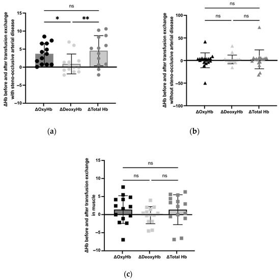 Measurement of ΔOxyHb, ΔDeoxyHb, and ΔTotal Hb before and after BET. Shaded boxes show values obtained. (a) ΔOxyHb, ΔDeoxyHb, and ΔTotal Hb in cerebral hemispheres with steno-occlusive arterial disease (n = 13). *, p < 0.05; **, p < 0.01 using the Friedman test. (b) ΔOxyHb, ΔDeoxyHb, and ΔTotal Hb in cerebral hemispheres without steno-occlusive arterial disease (n = 18). ns using the Friedman test. (c) ΔOxyHb, ΔDeoxyHb, and ΔTotal Hb in muscle (n = 14). ns using the Friedman test.